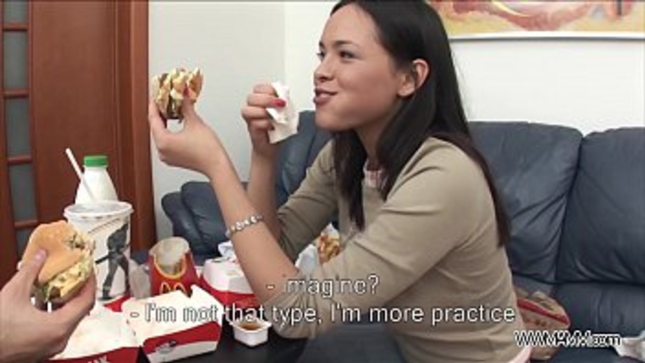 A super hot young Russian brunette with big tits and a shaved pussy gets her ass fisted before getting fucked hard. She gives a deepthroat blowjob and takes the big dick deep in her juicy ass. He cums inside her, making her a creampie mess.